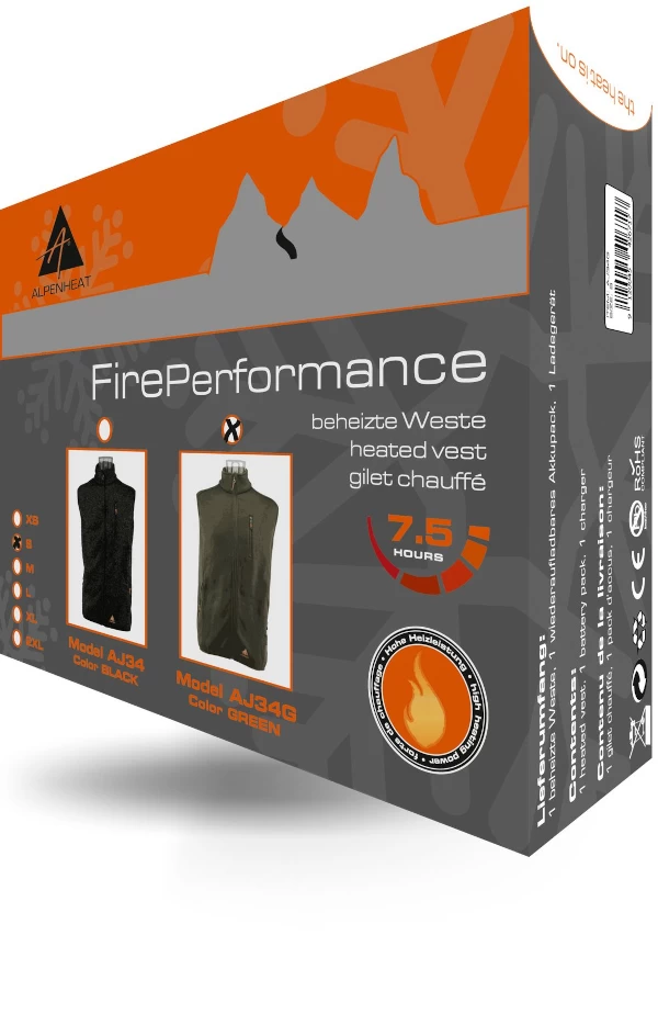 The Alpenheat Alpenheat Heated Vest Fleece features a heating pad integrated into the back. The special heating element is connected to a li-ion battery pack with which you can also control the heating. The Fire-Performance has 4 heating modes. Because of the flexible bio-thermal fibers of the heating pad, the vest is light and comfortable. Wear the Fire Performance as a body warmer and you are always comfortable, even when it’s cold. Perfect to wear outside, but also for example in a cold car: as if you have seat heating! The material is light, thin and already warm by itself, so this vest is also ideal as an extra layer under your jacket. The Fire-Performance offers good protection and pleasant warmth, even in icy temperatures. Use while skiing, snowboarding, hunting, fishing, horseback riding, hiking, biking or watching an ice hockey or soccer game as a spectator. People who are in wheelchairs especially benefit from the warmth of the vest!